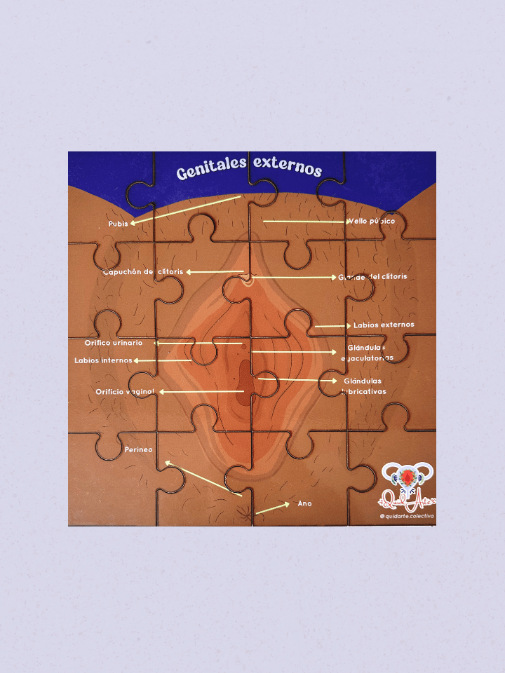 Rompecabezas didáctico de vulva, elaborado en mdf de 3mm, laminado. Contiene 16 piezas. Medidas: 30 *30. Viene con su respectiva bolsa de tela